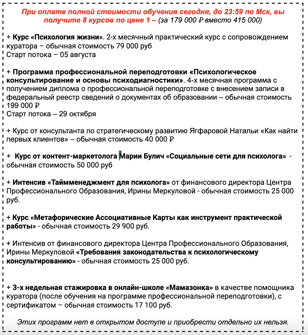 Для вас, как участника мастер-класса действует специальное предложение на обучение по программе профессиональной переподготовки с Кариной Рихтере «Психологическое консультирование и основы психодиагностики».